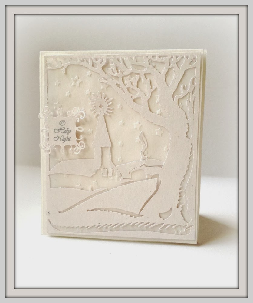 Card Number 2 - O Holy Night Winter Scene. The structure is supposed to be a church with a steeple but I am thinking the details are not appearing properly in the photo. Also the sentiment is 'O Holy Night' which again is not really visible.